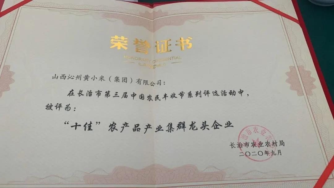 ★長治市有機旱作農業暨美麗鄉村建設現場觀摩會上,沁州牌小米被評為“長治市十佳名優特色農產品”,山西沁州黃小米集團被評為“長治市十佳農產品產業集群龍頭企業”。