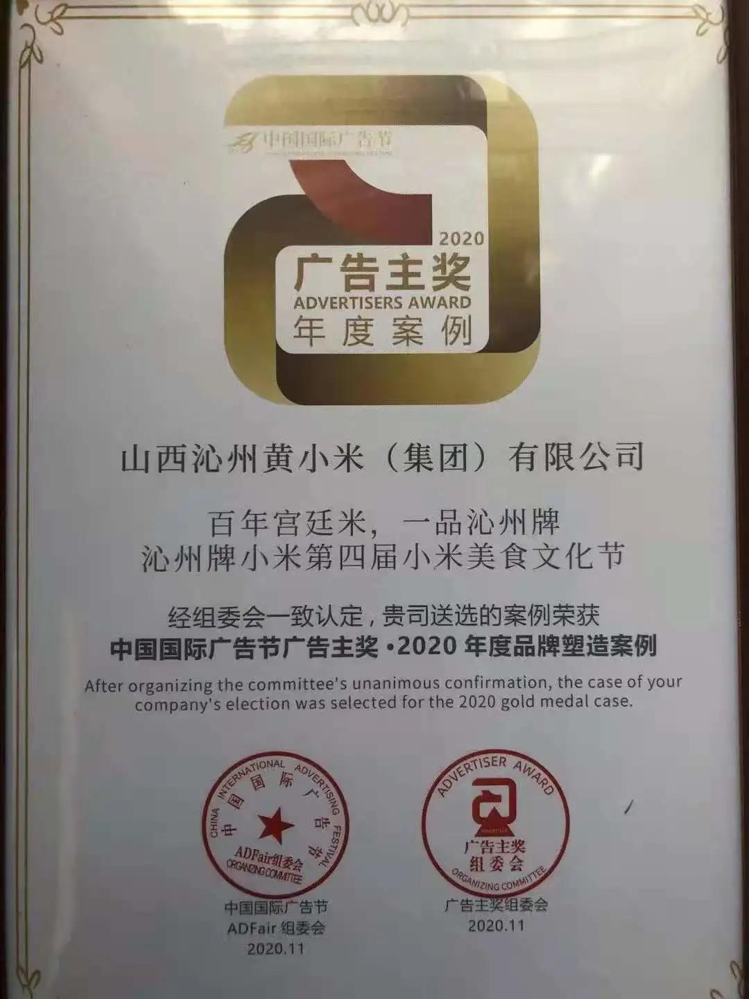 在業(yè)界享譽盛名,素有“中國廣告界奧斯卡”之稱的中國國際廣告節(jié)-廣告主盛典盛,經(jīng)組委會一致認定,山西沁州黃小米(集團)有限公司-百年宮廷米,一品沁州牌-沁州牌小米第四屆小米美食文化節(jié)斬獲得“中國國際廣告節(jié)廣告主獎·2020年度品牌塑造案例”!