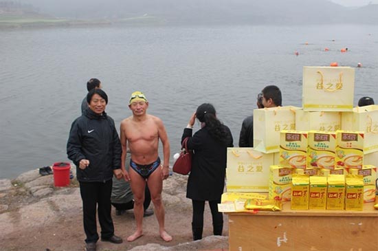 冬泳愛好者齊聚沁縣風光如畫的圪蘆湖旅游區,相互切磋和交流經驗與心得。之后,各位冬泳勇士們不懼嚴寒,果斷的跳入水中,激情隨浪花瞬間騰起。此時水溫10度,天氣雖然寒冷,但各位冬泳者轉眼游出了一百多米遠,其中年紀最大的一位女士已六十周歲。令在岸邊觀看的人們不由得贊嘆!